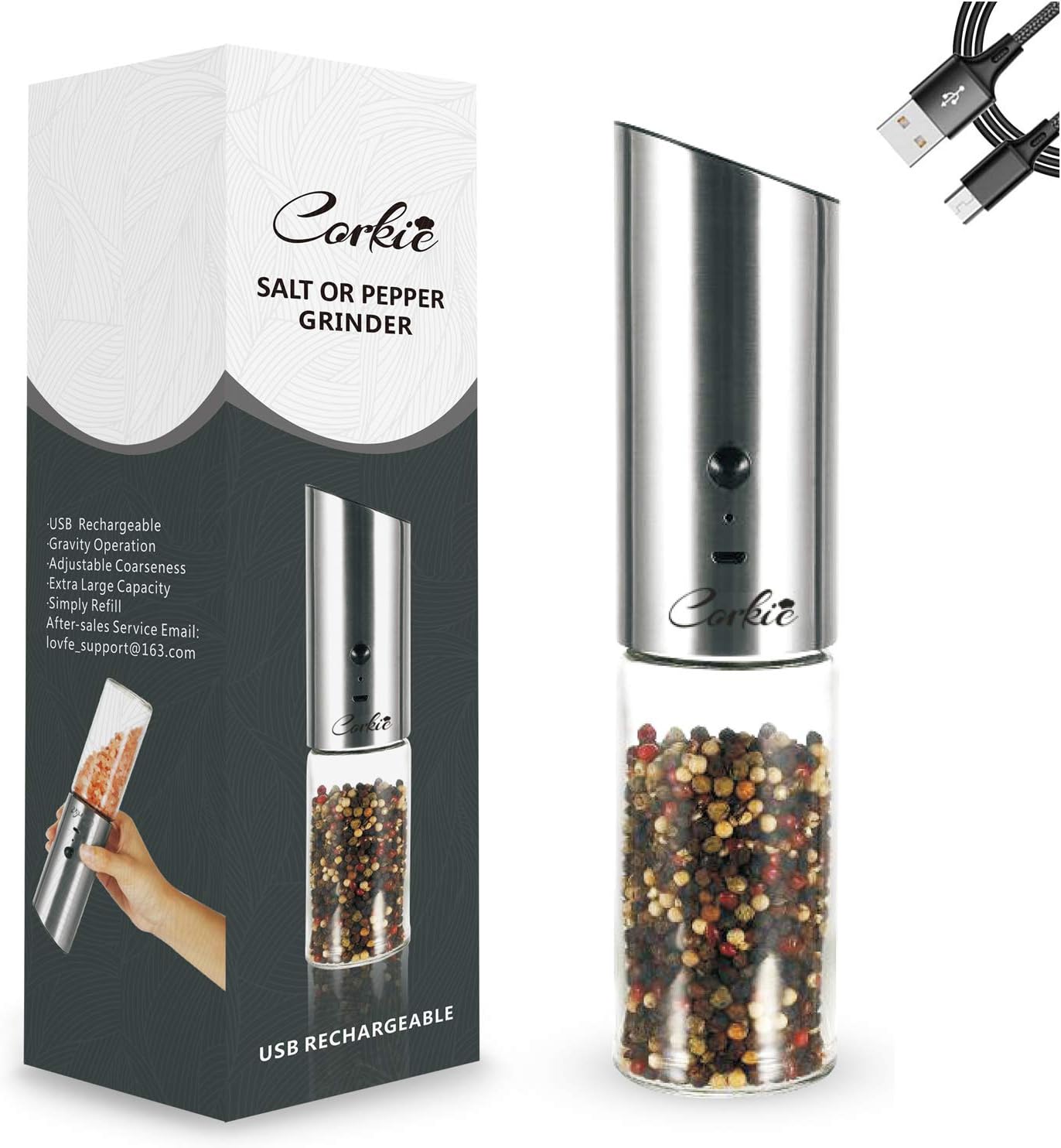 Amazon Com Rechargeable Electric Salt Or Pepper Grinder Corkie Pepper Mill With Adjustable Coarseness Gravity Automatic Salt Mill 170ml High Capacity Refillable Pepper Mill For Christmas Gift Kitchen Dining