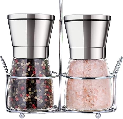 Glass body and ceramic grinder this unique duo is a professional sleek addition to any kitchen with a stainless steel lid that truly caps off this beautiful pepper mill grinder set. A dash of salt here a ground of pepper there. See collection for more.