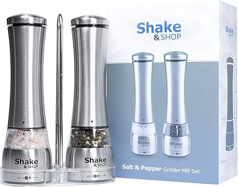 Amazon Com Shake Shop Electric Salt And Pepper Grinder Set Adjustable Coarseness Stainless Steel Battery Operated Mill With Led Light And Complimentary Mill Rest Pack Of 2 Mills Kitchen Dining