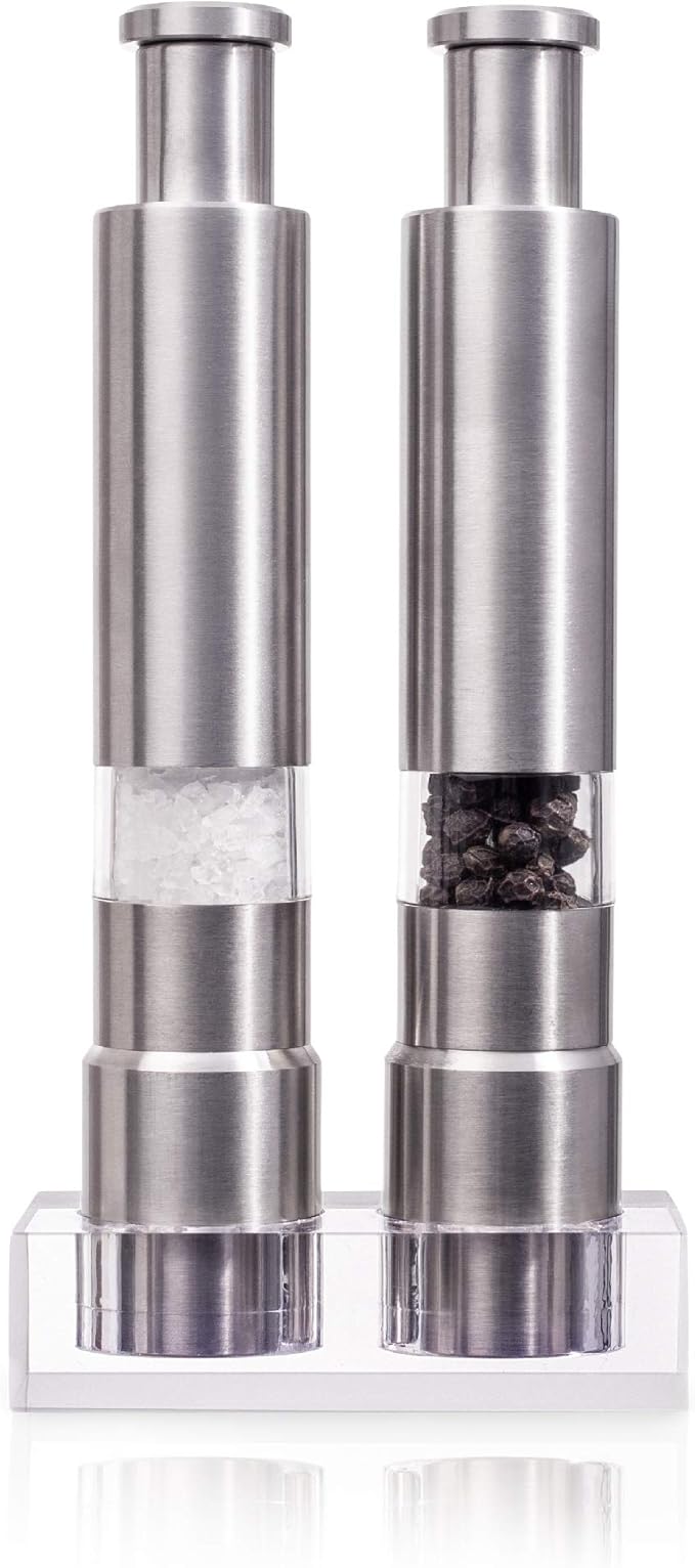 45 out of 5 stars 9. Everyone loves the taste of fresh ground pepper and sea salt but dealing with a giant grinding mill is inconvenient at best. One push of the button automatically grinds and dispenses the perfect amount of salt or pepper.