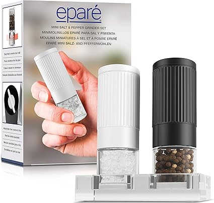 One push of the button automatically grinds and dispenses the perfect amount of salt or pepper. Whether youre a minimalist or just want to preserve as much counter space as possible the Eparé 2 in 1 appx. A simple flip of the wrist automatically triggers the gravity sensors to begin the grinding process and stops the moment you return it to its upright position.