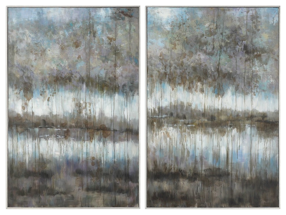 Set Of 2 Large Modern Forest Abstract Paintings Silver Gray Blue Trees Pond Contemporary Paintings By My Swanky Home